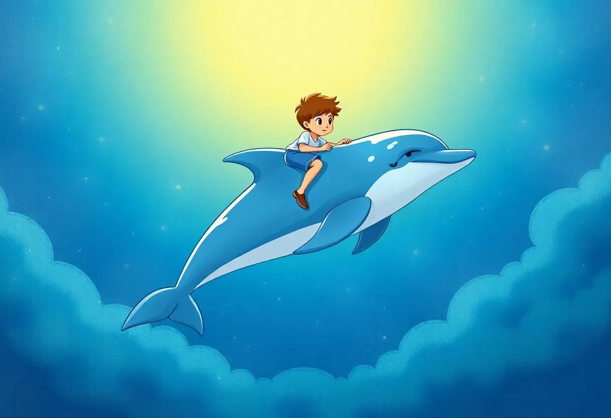 As the boy clung gently to the sleek, shimmering back of the flying dolphin, they glided through the sky like whispers of the night. The stars, twinkling like a million tiny lanterns, seemed to wink in approval, lighting their path with soft, silvery beams. The crisp, cool air was filled with the subtle melody of waves lapping against distant shores, mingling with the dolphin’s playful clicks and whistles.It was here, cradled by the vast, endless expanse, that the boy felt time slow, as if the universe itself had paused to watch their peaceful voyage.