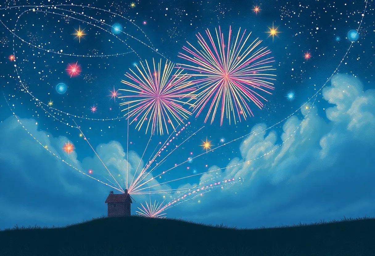 With every burst, the firework told a new story, painting wonders that glowed like glowing gems, turning bedtime into an adventure where the sky itself became a storyteller, lulling young hearts to sleep wrapped in the magic of the night.