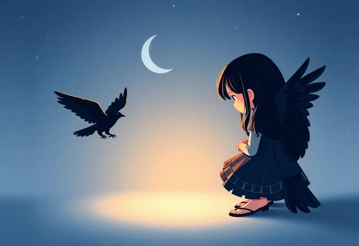 Under the vast velvet sky, when the stars whispered secrets only the night could understand, a mysterious crow fluttered down to the curious girl. With feathers as dark as shadows and eyes gleaming with ancient wisdom, the crow offered her a gift unlike any other – a shimmering feather that glowed softly, casting a gentle light in the deepest darkness. This magical gift did more than just brighten the night; it revealed hidden wonders and painted the sleepy world in hues only dreams could hold. Holding the feather close,the girl discovered that every flutter sparked warm stories and quiet laughter,turning the quiet hours into moments of enchantment.