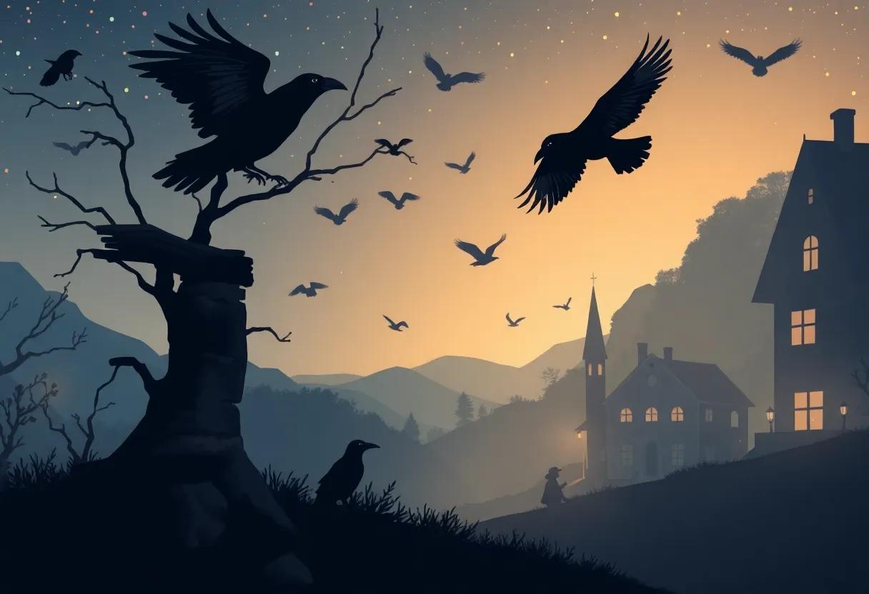Nestled beyond the whispering woods and a silver river that gleams under the moonlight, the village hummed softly with secrets only the night dared reveal. Houses made of honey-brushed stone glowed faintly from within, casting warm halos onto cobblestone streets wrapped in the gentle embrace of twilight. The air sparkled with the magic of unseen wings, as shadows of large black crows danced silently through the air, their feathers catching the last flickers of golden sun. Here, every rustle and murmur seemed alive with stories waiting to unfold, where children’s dreams met the language of the night.