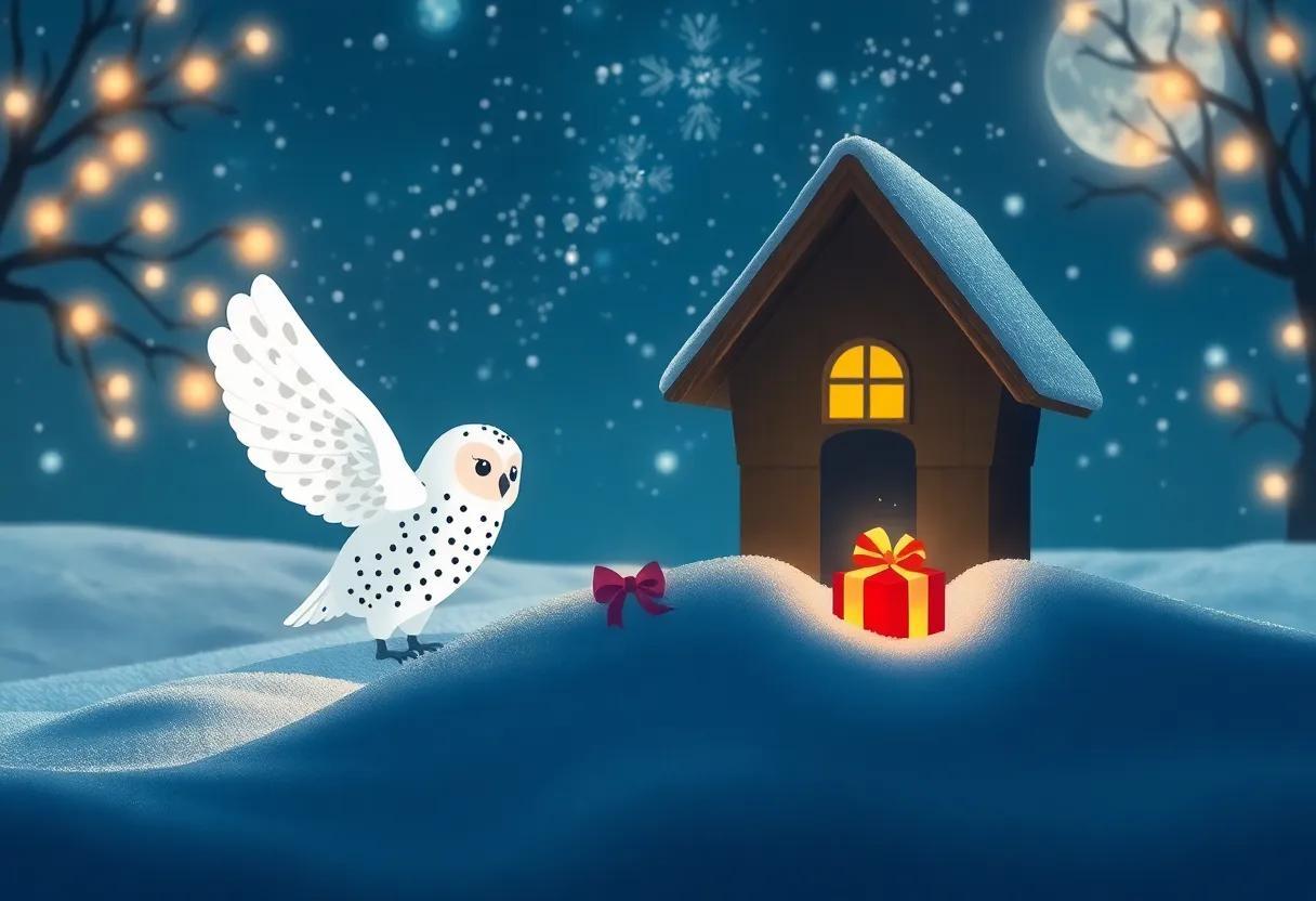 Children who listen closely might hear the soft flutter and glimpse the sparkling feathers as the snowy owl glides through the crisp night air. This enchanted flight reveals: